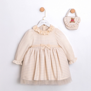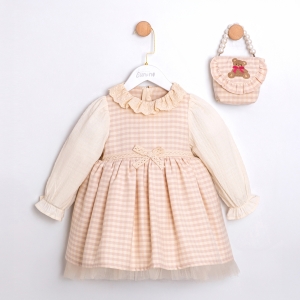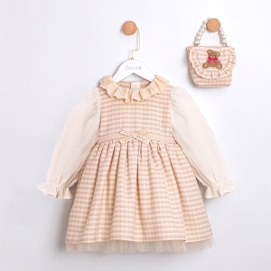 VİNTAGE EKOSE DESENLİ ÇANTALI KIZ BEBEK ELBİSE